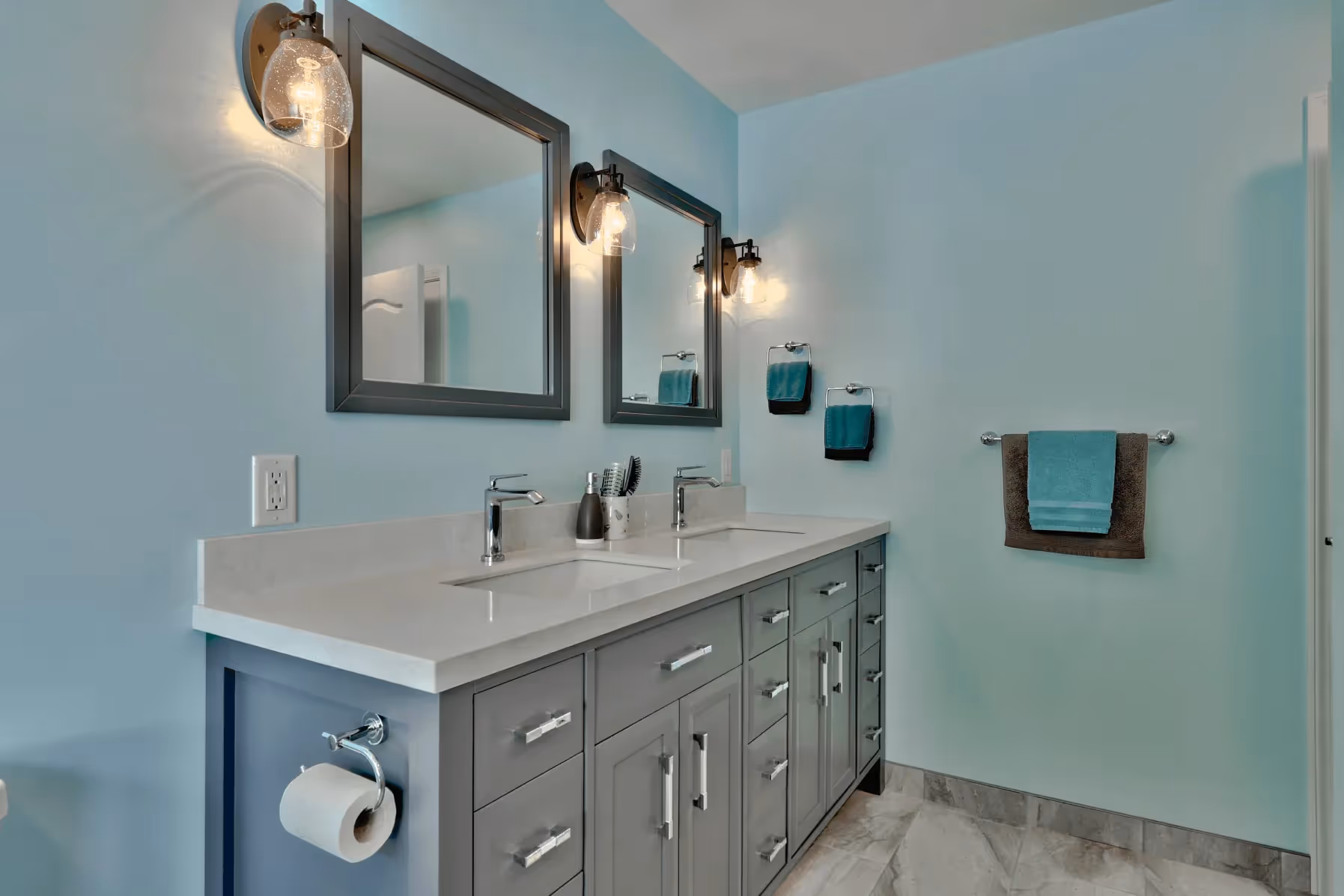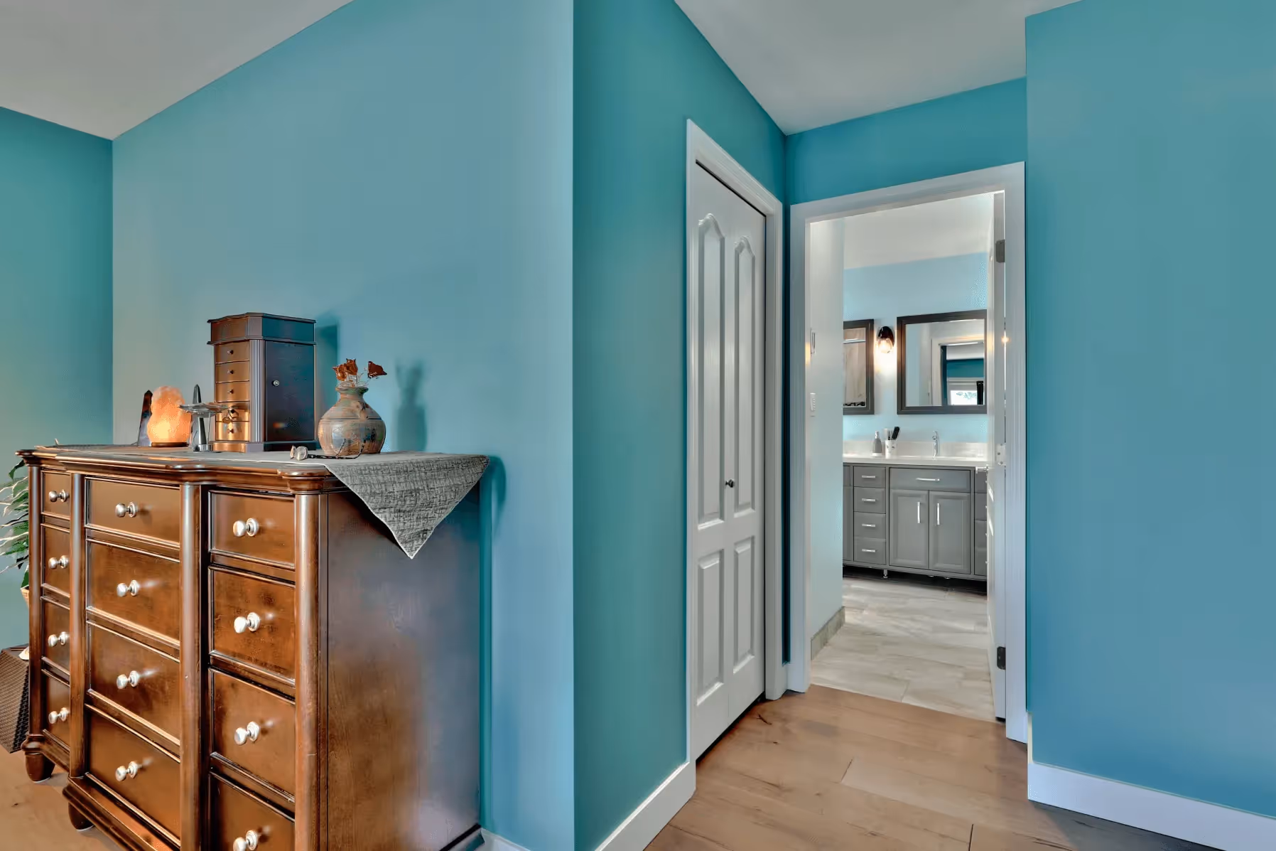Though this was considered a “small” renovation, we were able to transform an ensuite bathroom from a dated and awkward space into a lush turquoise oasis complete with double vanity, large tile shower, freestanding tub, and an enlarged walk-in closet.