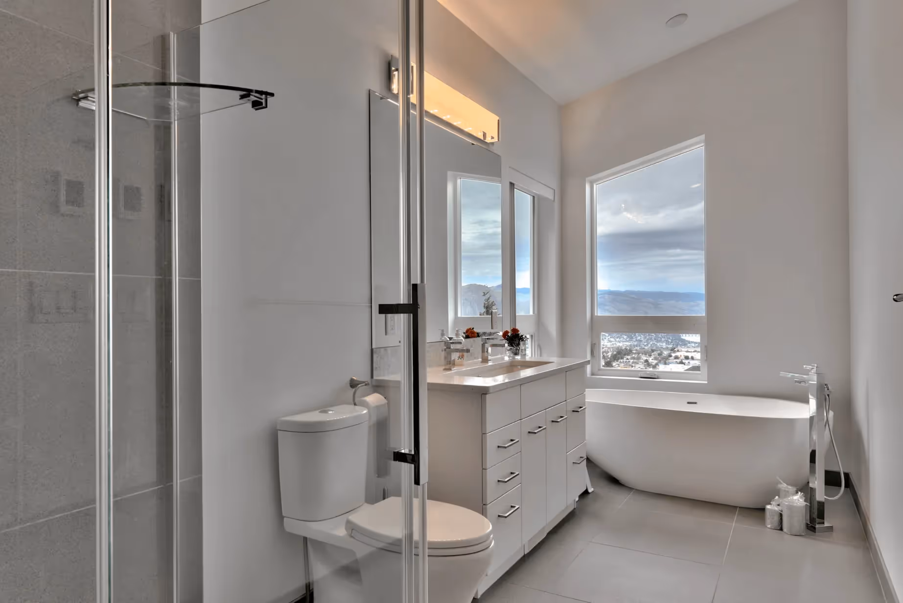 A super modern minimalist white interior styling complemented to the oversized glass floor to ceiling windows perfectly framed the Kamloops views.